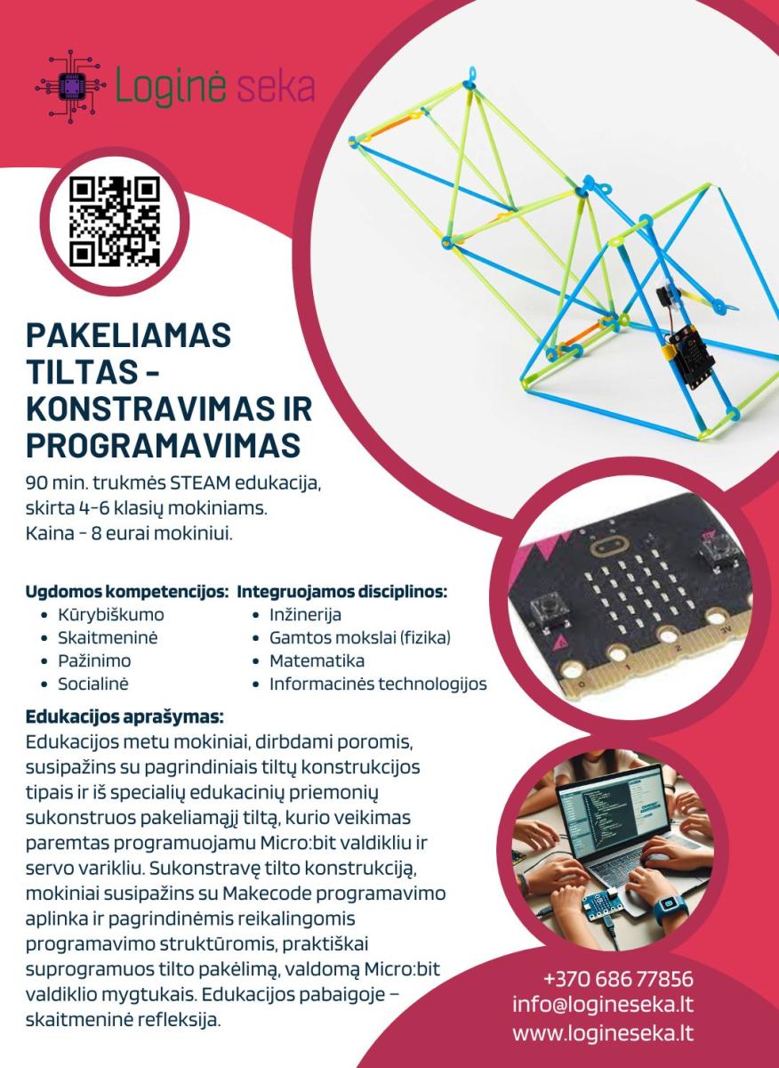 Naudodami „Strawbees“ konstrukcinius elementus ir micro:bit mikrokompiuterius, vaikai kurs tilto konstrukciją bei patys rašys programą, valdančią jo pakėlimą. Tai – įtraukianti veikla, jungianti architektūrą ir programavimą, o kartu lavinanti loginį mąstymą, kūrybiškumą ir bendravimo įgūdžius.